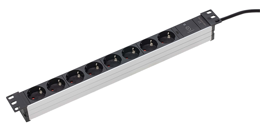 Aluminium Stekkerdoos 19" Rack 8x randaarde met beveliging kabel H05VV-F 3G1,5 zwart 2m
