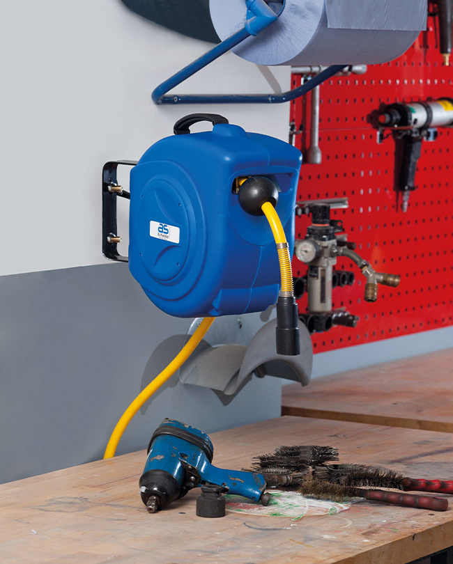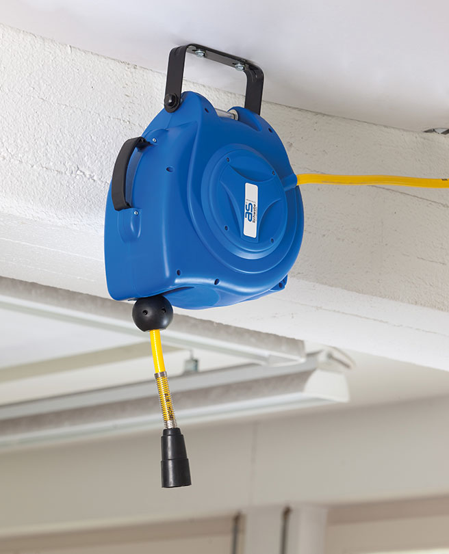 Persluchtslanghaspel met robuuste, blauwe kunststof behuizing