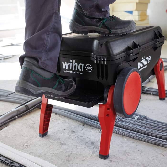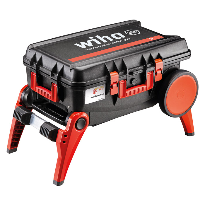Bovendien is door de verhoogde positie een comfortabel uitnemen van de gereedschappen mogelijk, waarbij de rug ontzien wordt. De V-vormige inkeping met schaalverdeling in het kofferdeksel maakt het