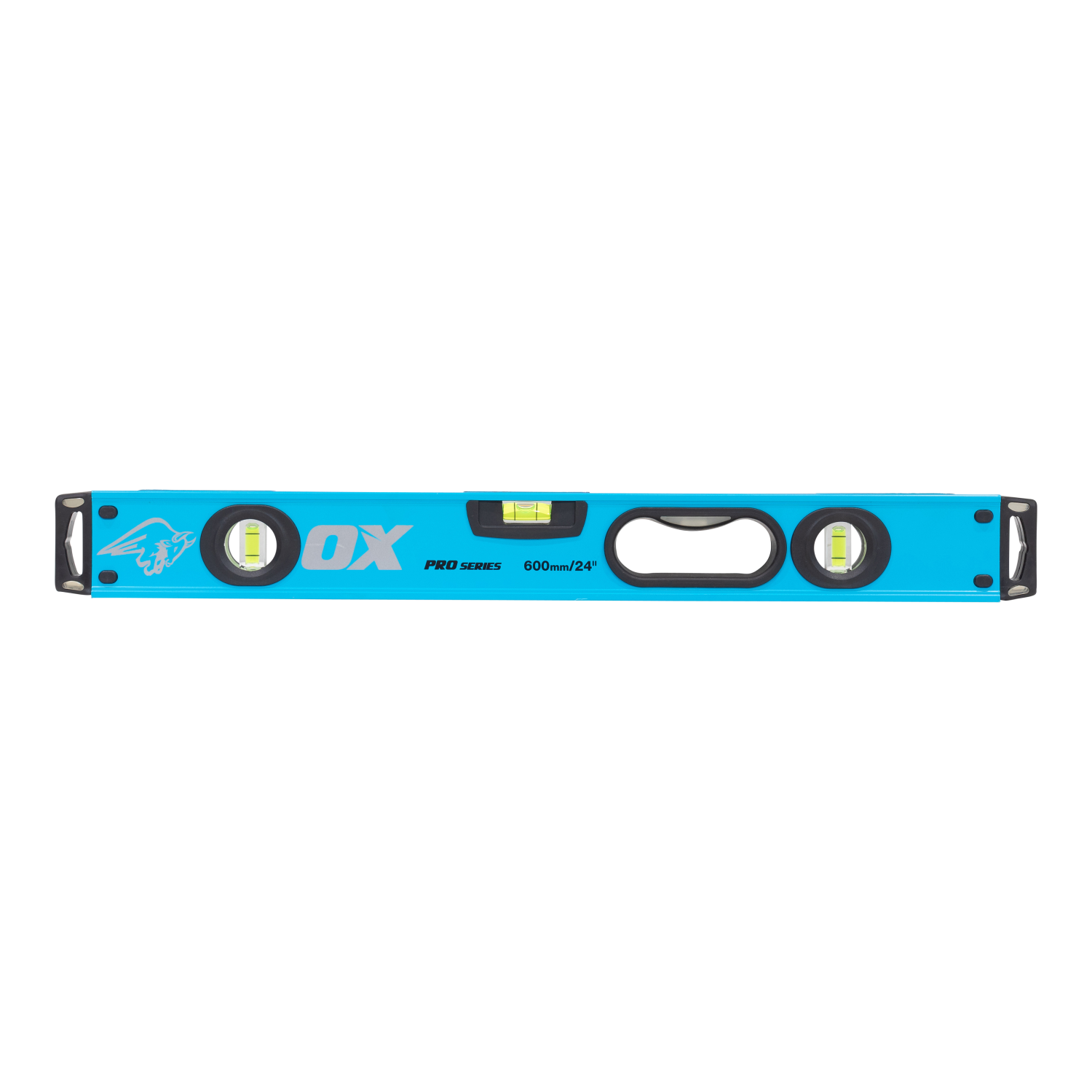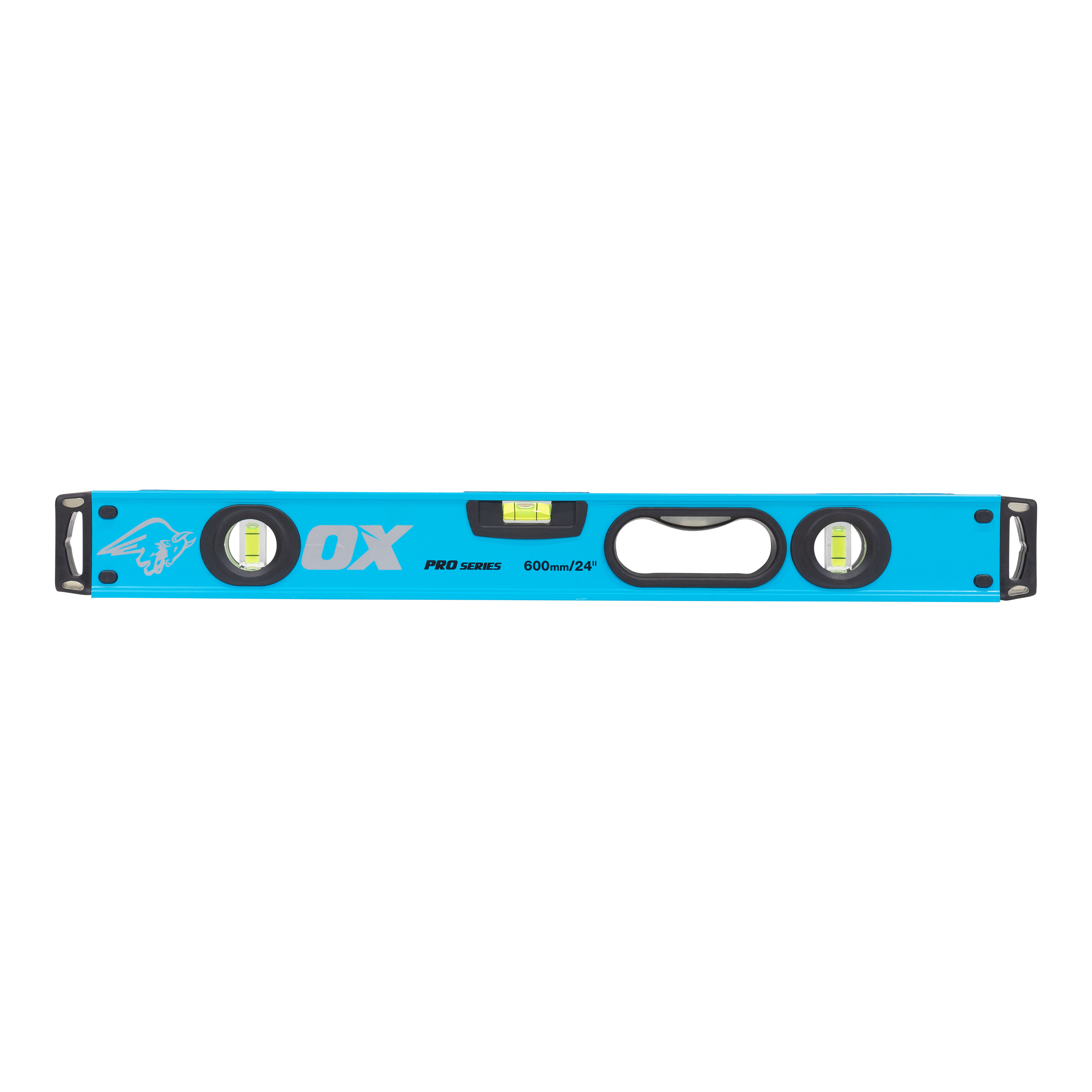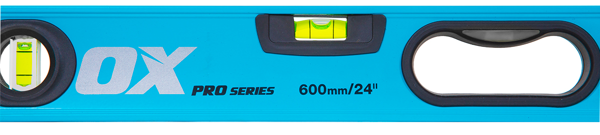 De ongelooflijk sterke OX Pro Waterpas is voorzien van unieke, zeer nauwkeurige, UV-bestendige en vergrote dubbele Easy View libellen. Het sterke aluminium profiel is aan de boven- en onderrand fijn gefreesd voor 100% precisie. Voorzien van gemakkelijk vast te houden siliconen handgrepen met luchtkussens en perfect gepositioneerde rubberen noppen voor krasbescherming bij het drukken tegen een muur en voor extra grip op het oppervlak. Schokbestendige eindkappen beschermen tegen vallen en stoten ter plaatse.