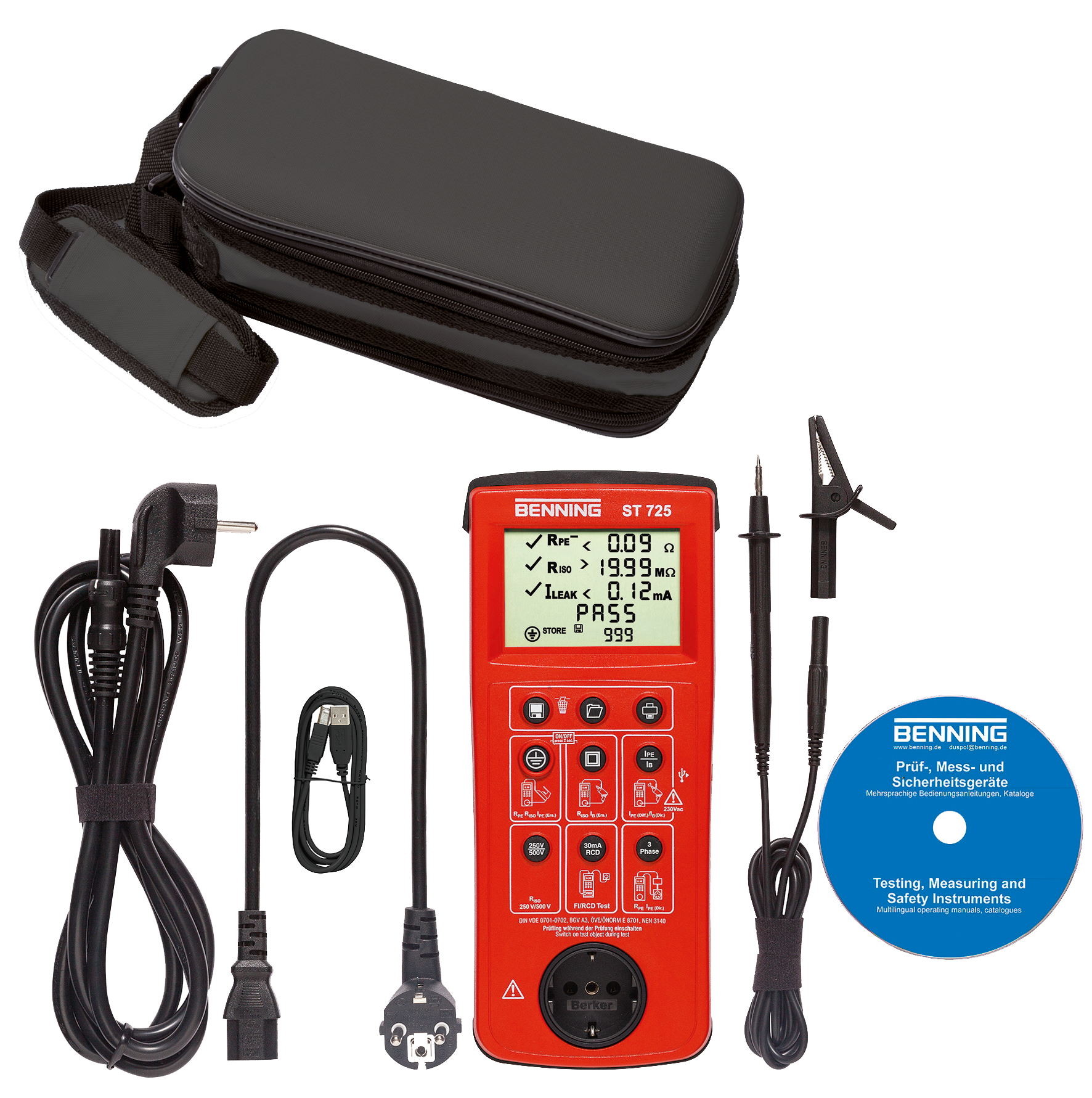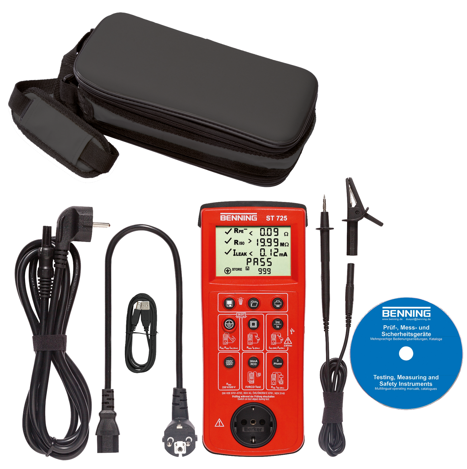 • Inclusief draagtas, netaansluitkabel, testsnoer met krokodillenklem, apparatensnoer, micro-USB kabel, downloadsoftware (CD), batterijen en gebruiksaanwijzing