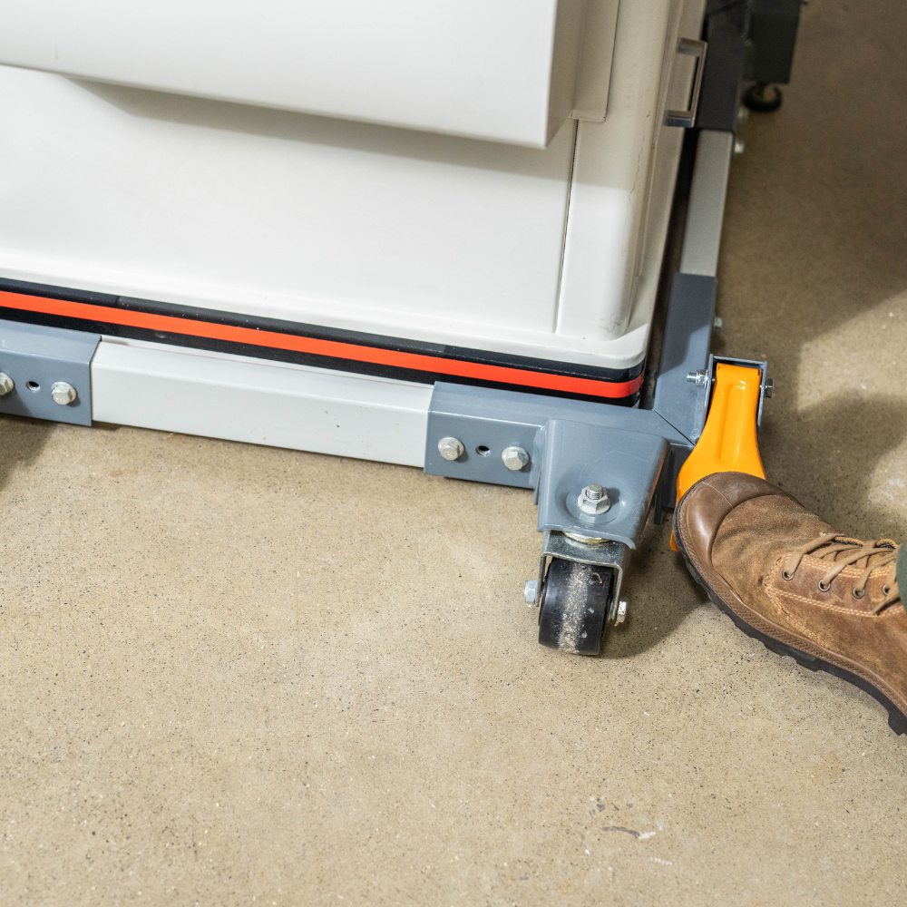 Volledig verstelbaar rolplatform met vier volledig draaibare wielen om zelfs uw zwaarste apparatuur met één vingerbeweging over de werkvloer te verplaatsen.